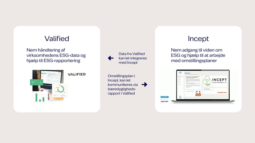 Bruger I allerede rapporteringsværktøjet Valified i jeres virksomhed, kan I nemt integrere data herfra med Incept Sustainability. Og I kan fx udarbejde jeres omstillingsplan i Incept og kommunikere den via bæredygtighedsrapporten i Valified. Â